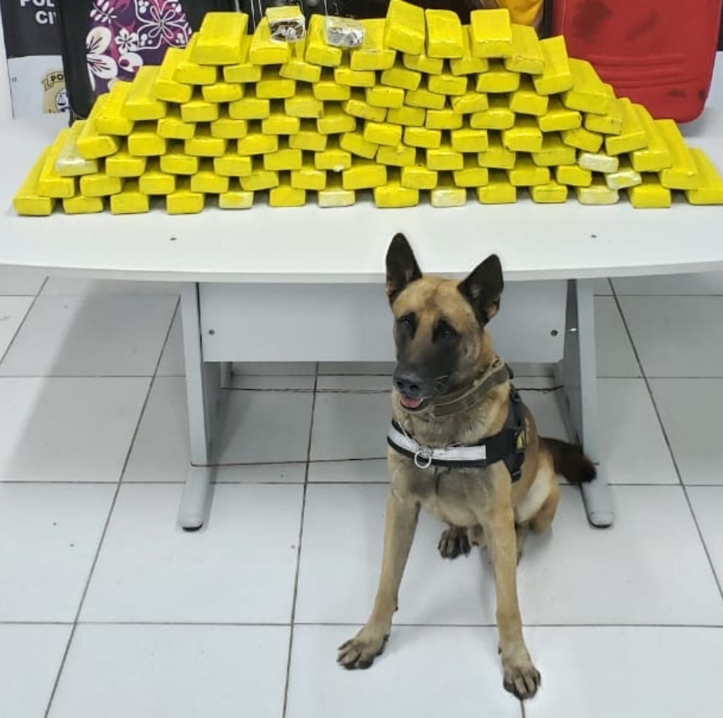 Para isso, as equipes policiais se utilizaram do cão farejador “Viny”. Por volta das 18hs30min, foi parado um ônibus que fazia a linha Teresina/PI-São Luís/MA, quando, após as malas e bolsas serem retiradas dos bagageiros, o cão farejador Viny indicou três malas e uma bolsa. As equipes policiais passaram a revistar os objetos indicados, quando encontraram 93 (noventa e três) peças de substância vegetal com características semelhantes a popularmente maconha, pesando aproximadamente, 70kg (setenta quilos).